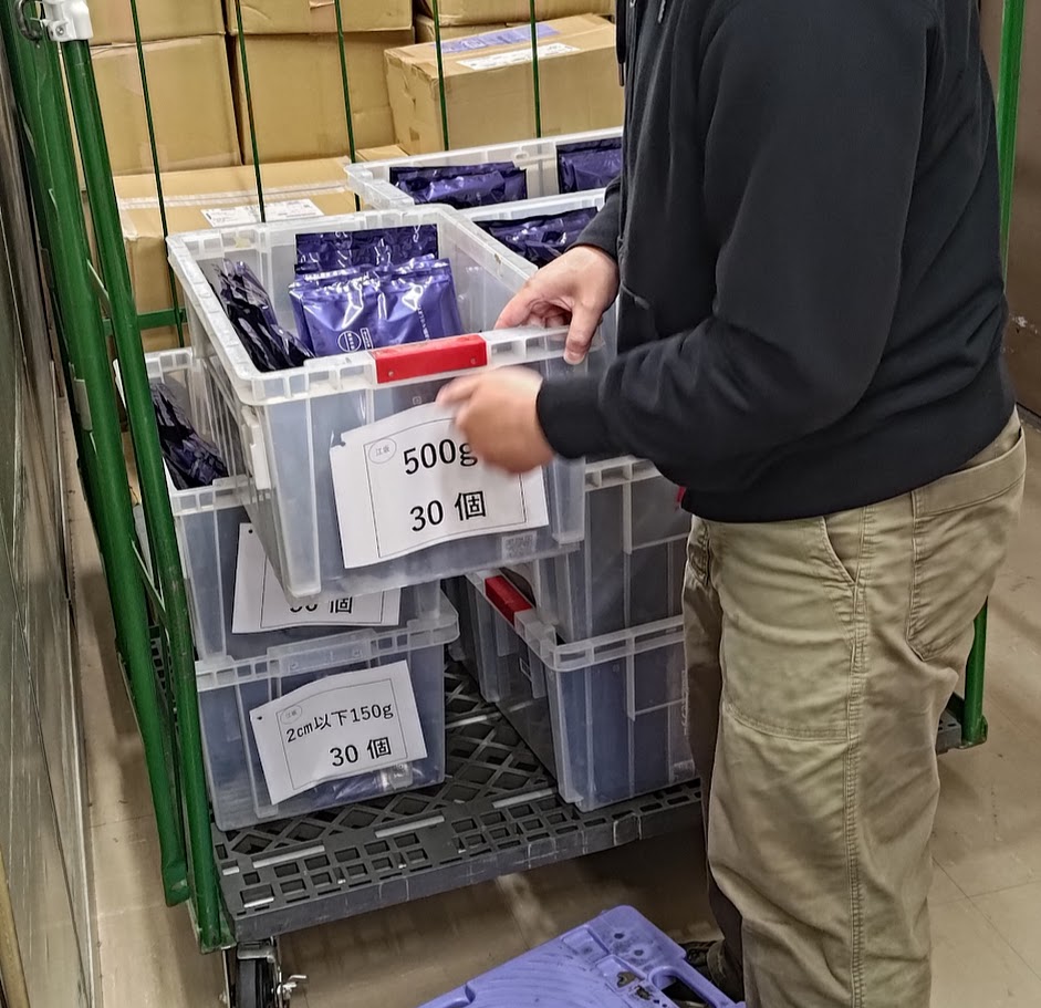 商品のgと個数に合わせて、郵便局の方が分かるように紙を貼っていきます。