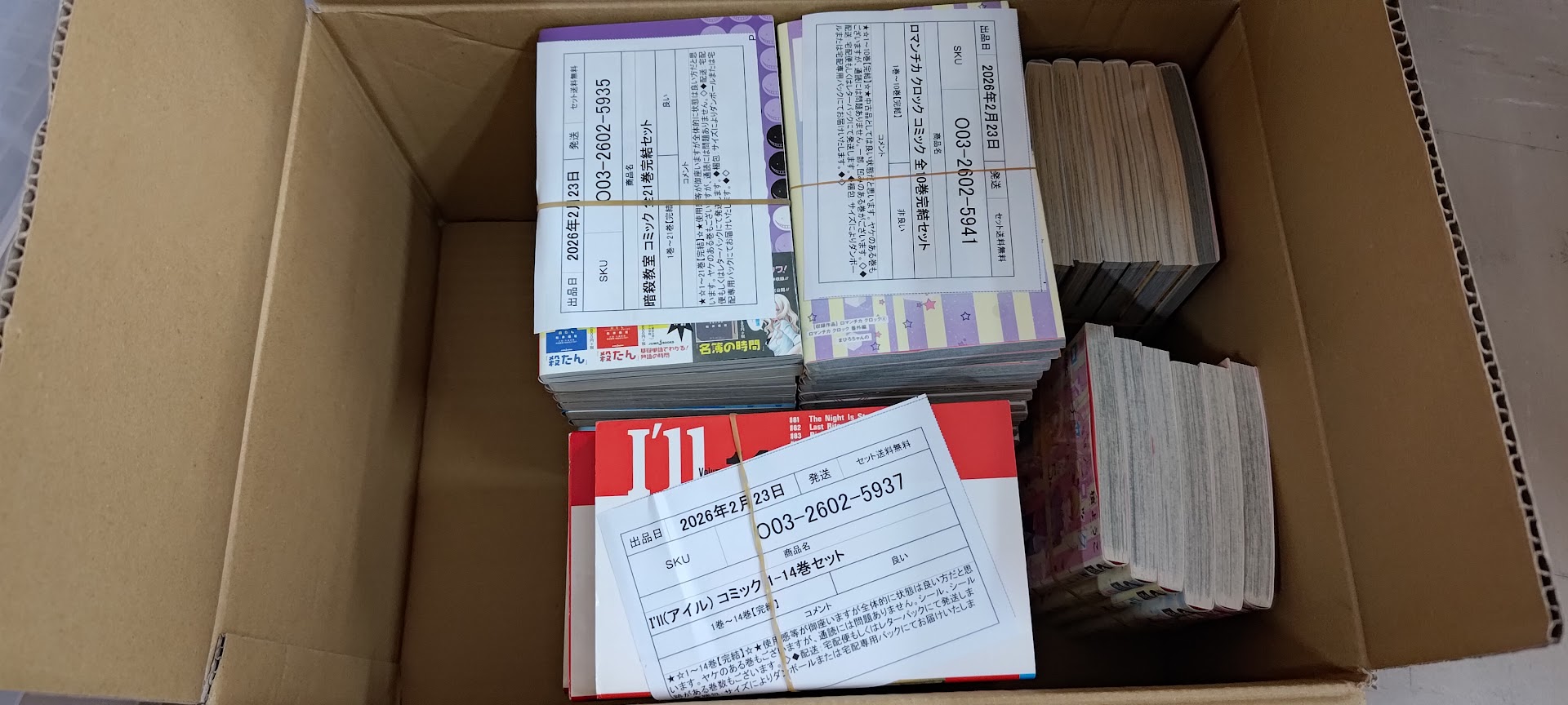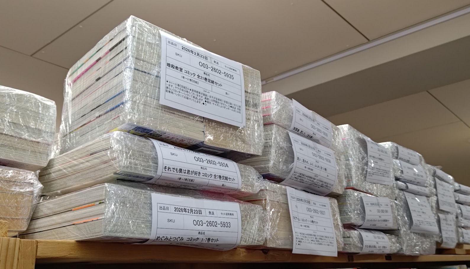 コミックセットは、査定が完了して通販サイトに掲載されたら、上記の写真のように梱包しやすいようにラッピングして倉庫に保管する必要があります。