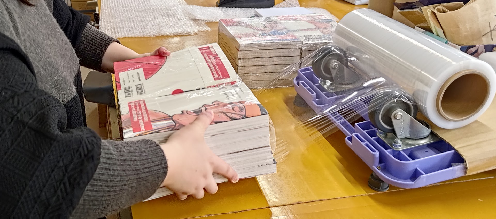 漫画によっては数十巻、あるいは百巻を越える商品を巻かなければならない時がありますが、そんな時は一人だけでなくみんなで協力してラッピングしています!